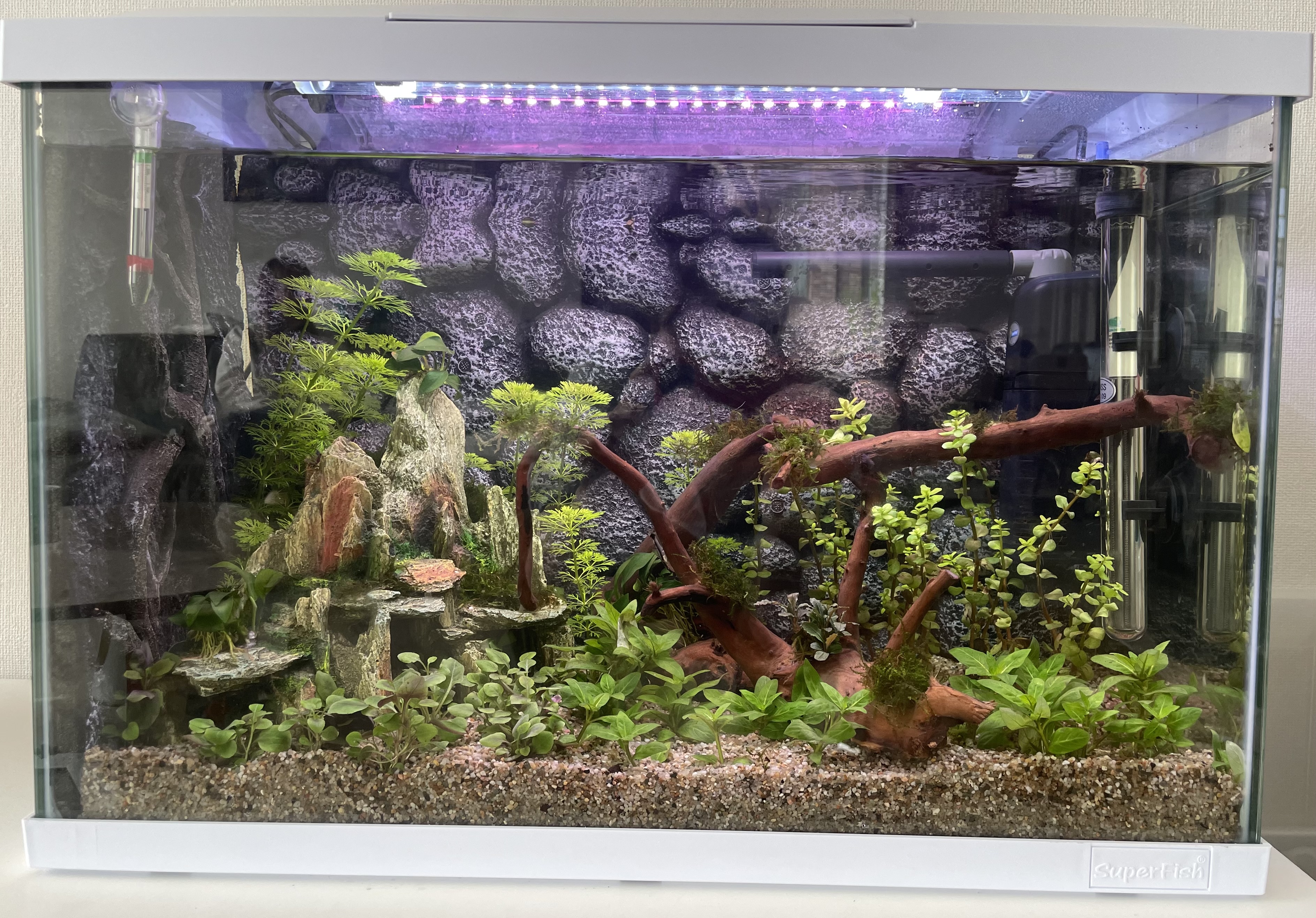 2 maanden geleden een superfish 70L aquarium aangeschaft. Eerste keer ooit. Alles is nieuw. Heel veel gelezen, zoveel dat het duizelde. Spiderwood gekocht en die 7 weken in een emmer gelegd zodat de tannines minder werden. Nu een week geleden ingericht (decoratie/ spiderwood/ planten).
