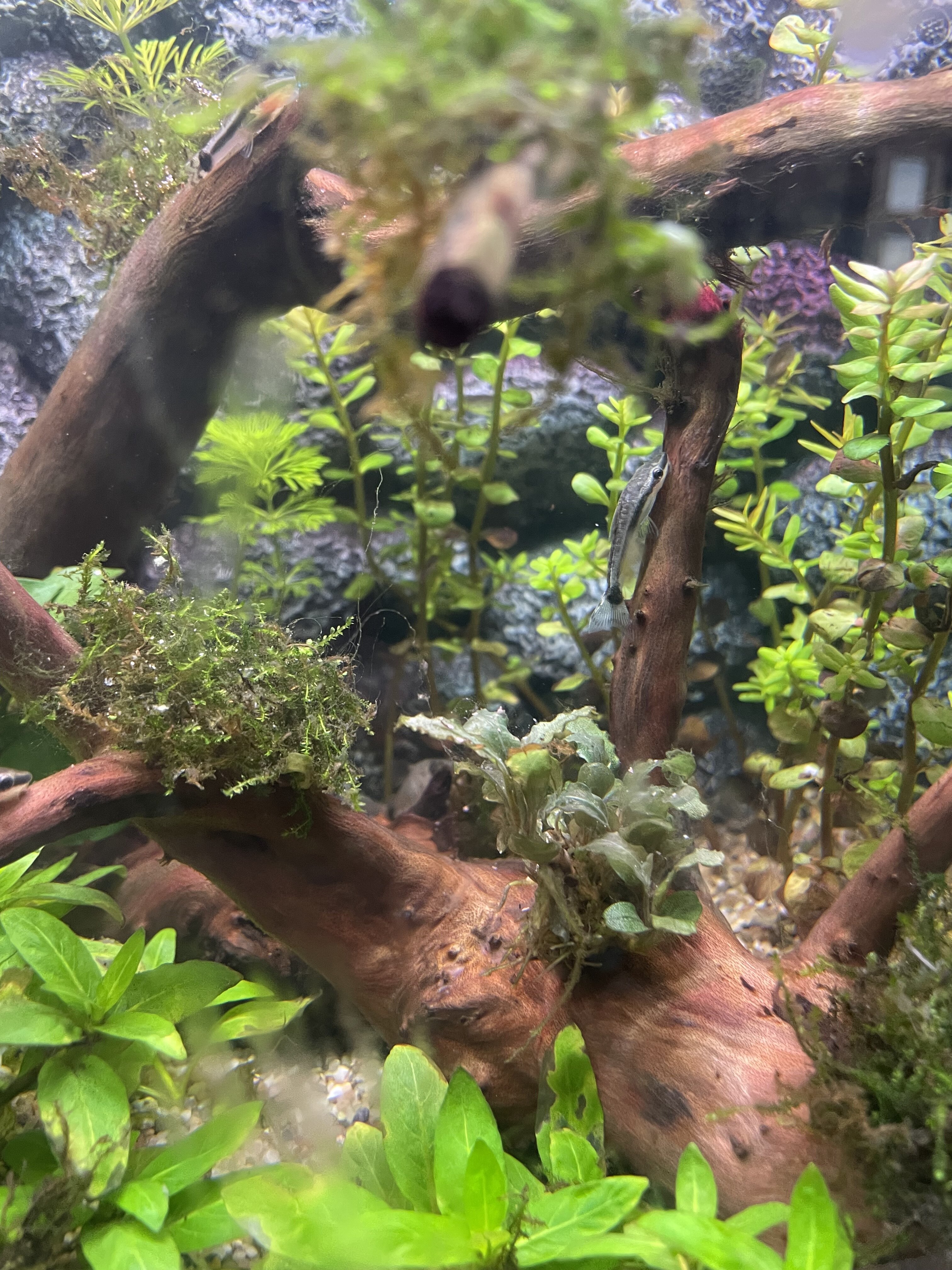 Het idee is/was om 3 lagen te creëren: garnalen op de bodem/ een schooltje tetra’s in het midden en eventueel bijlzalmpjes aan de bovenkant.