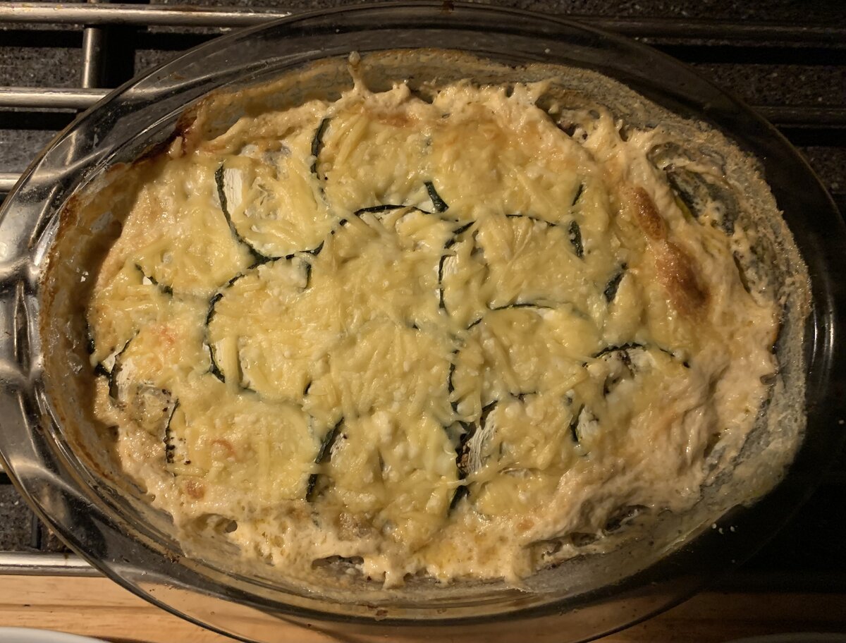 Gisteren ovenschotel met: aardappelschijfjes, tomatenplakjes, gehakt met ui en een beetje pesto, courgetteplakjes en geraspte 30+ kaas.