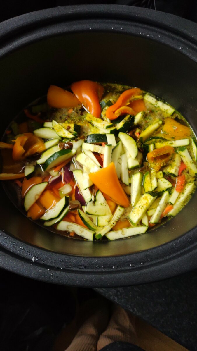 Een stoofschoteltje met spruitjes, paprika, ui, knoflook, kastanjechampignons, spekreepjes, een bakje kruidenroomkaas. In de slow cooker. In plaats van kookroom gebruik ik deze keer 'Oatly Haver Cuisine'. Maar er komt nogal wat vocht uit het vlees en groenten dus ik kijk tegen de tijd dat het klaar is hoeveel "room" ik nog toevoeg.