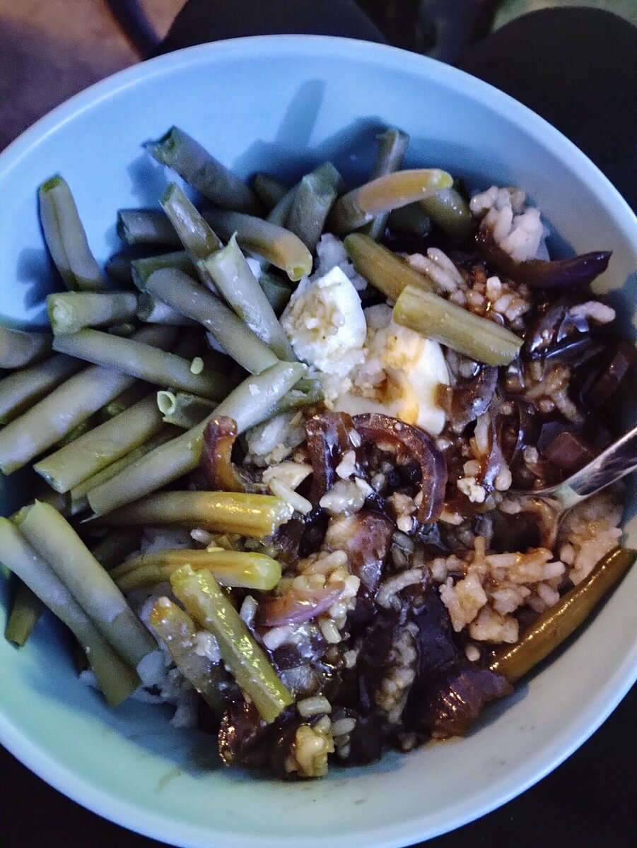 Rijst met ketjap saus rode ui knoflook en sperziebonen. Echt super lekker een aanrader om eens te eten.