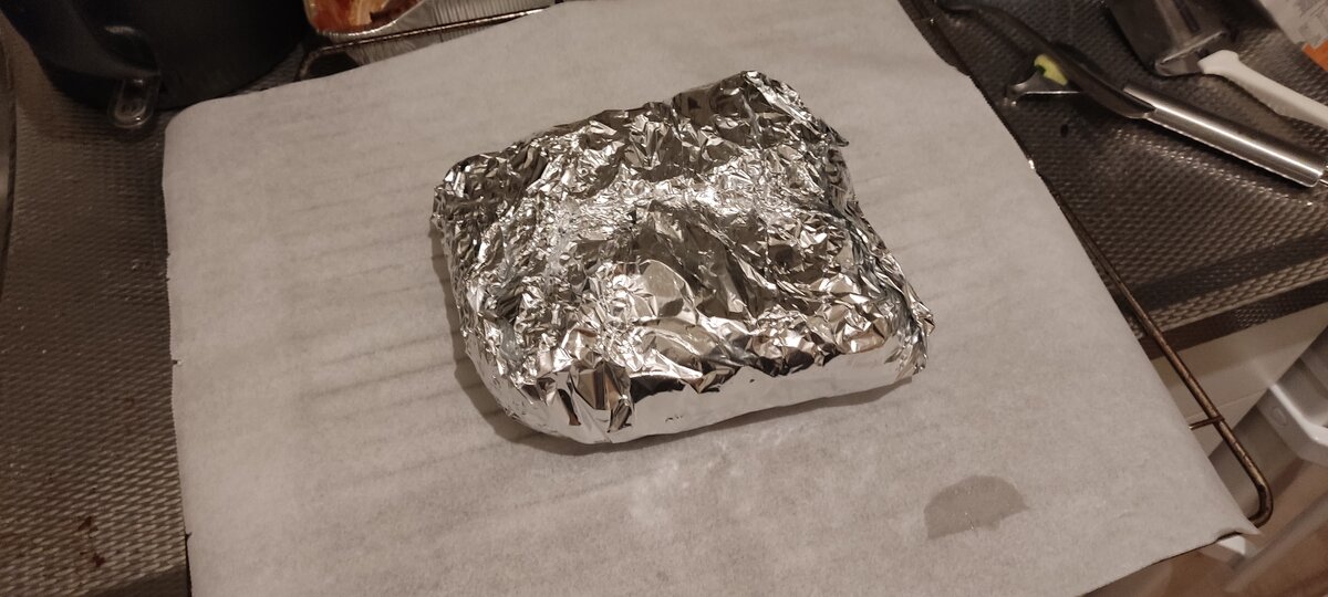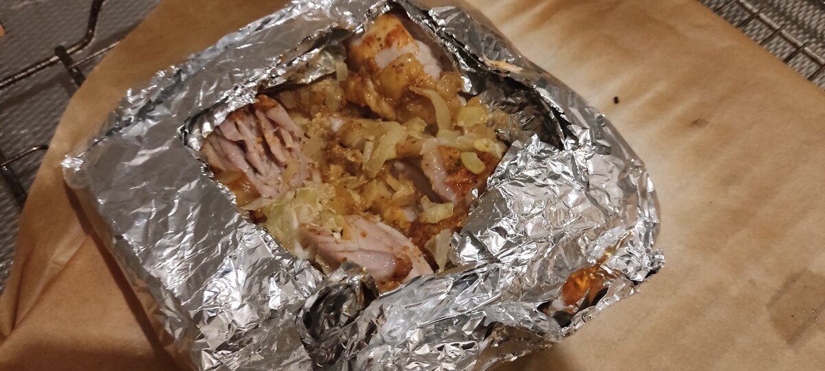Courgette, kip, ui, ketjap, peper, zout, half blikje zalm, beetje olijfolie en uiteindelijk bijna anderhalf uur in de oven. Enige wat ik niet meer moet doen is rechtstreeks van de folie eten 😆